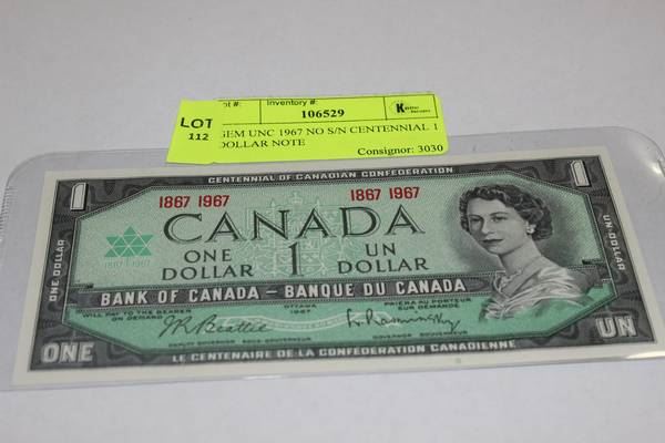 GEM UNC 1967 NO S/N CENTENNIAL 1 DOLLAR NOTE