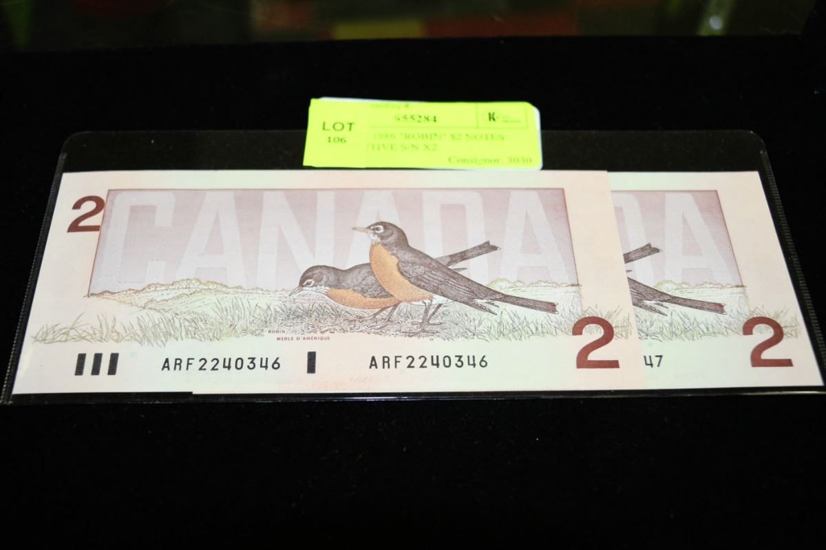 GEM UNC 1986 "ROBIN" $2 NOTES CONSECUTIVE S/N X2