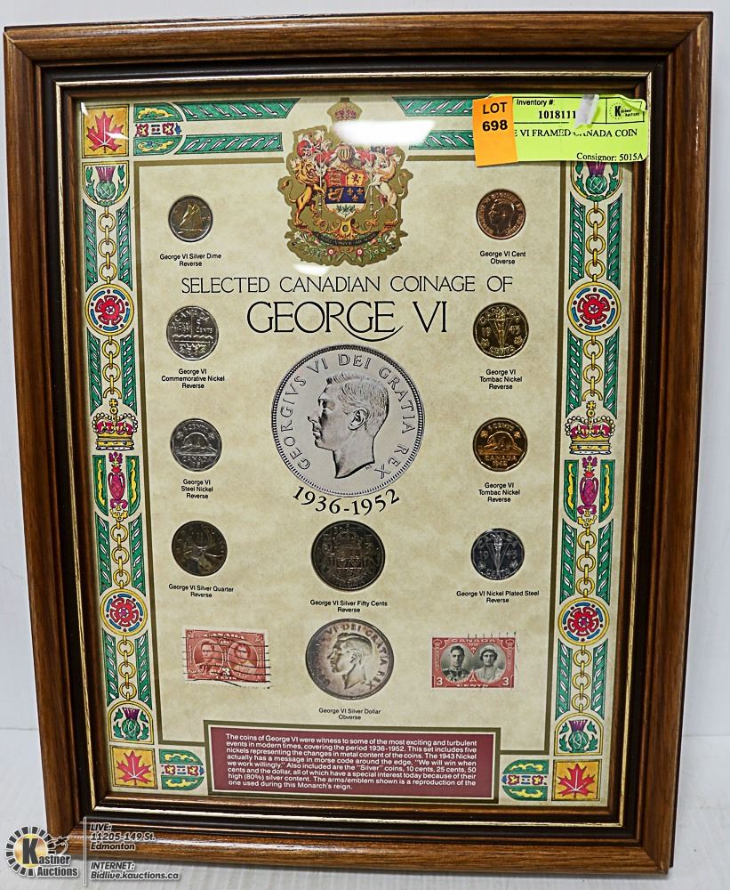BEAUTIFUL FRAMED COIN SET FROM REIGN OF KING GEORGE VI INCLUDING MANY DIFFERENT SILVER COINS 10C,25C,50C, AND DOLLAR WITH MANY COMMEMORATIVES. BEAUTIFUL FOR DISPLAY.