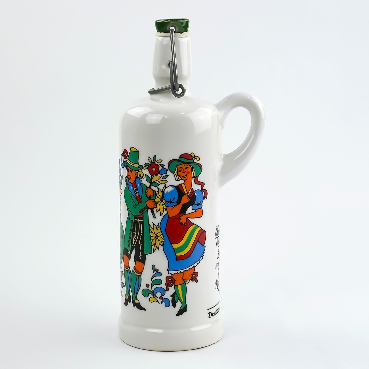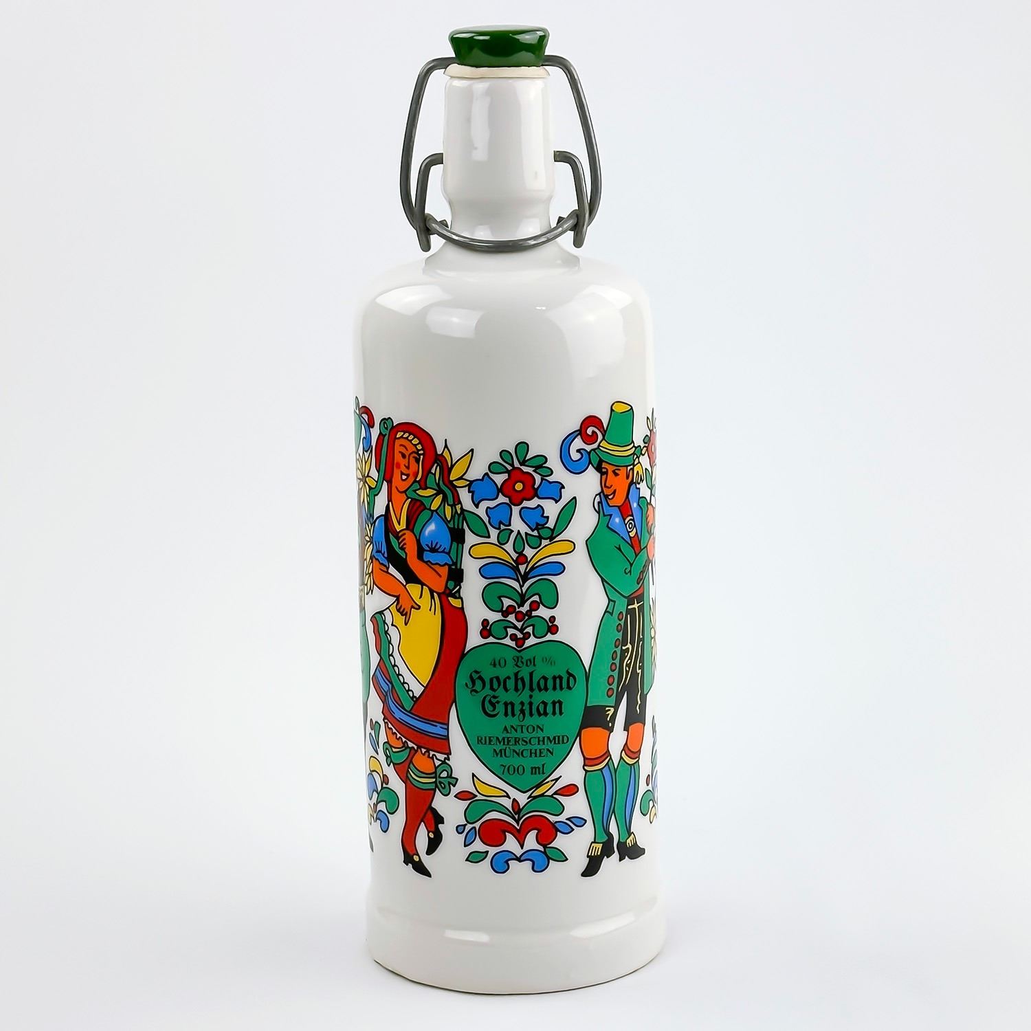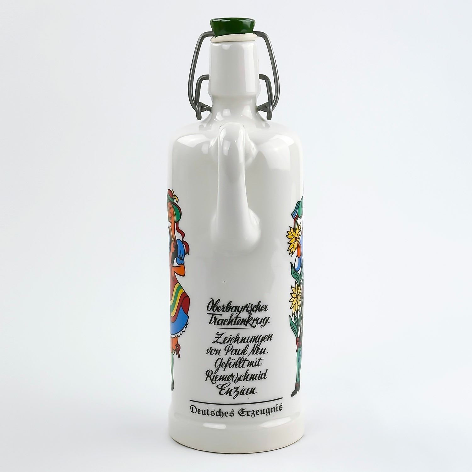 #8126 - EMPTY VINTAGE PORCELAIN BAVARIAN HOCHLAND ENZIAN ANTON RIEMERSCHMID MUNCHEN LIQUOR BOTTLE. BAR, BARWARE OR HOME DECOR BOTTLE. MEASURES: 9.75” (25 CM) TALL BY 4.5” (11.5 CM) WIDE - INCLUDES HANDLE AND 3.25” (8.25 CM) DIAMETER BASE