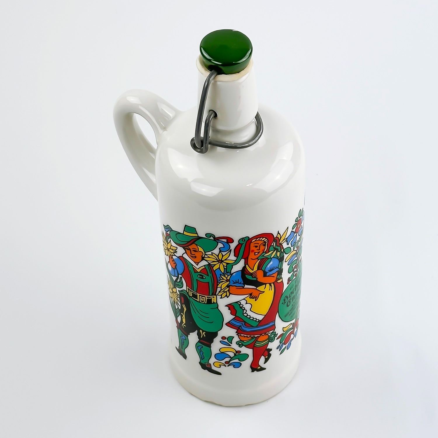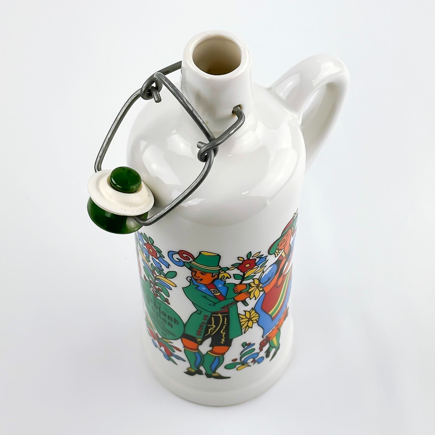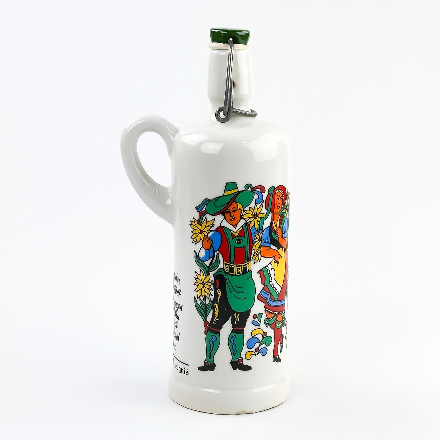 #8126 - EMPTY VINTAGE PORCELAIN BAVARIAN HOCHLAND ENZIAN ANTON RIEMERSCHMID MUNCHEN LIQUOR BOTTLE. BAR, BARWARE OR HOME DECOR BOTTLE. MEASURES: 9.75” (25 CM) TALL BY 4.5” (11.5 CM) WIDE - INCLUDES HANDLE AND 3.25” (8.25 CM) DIAMETER BASE