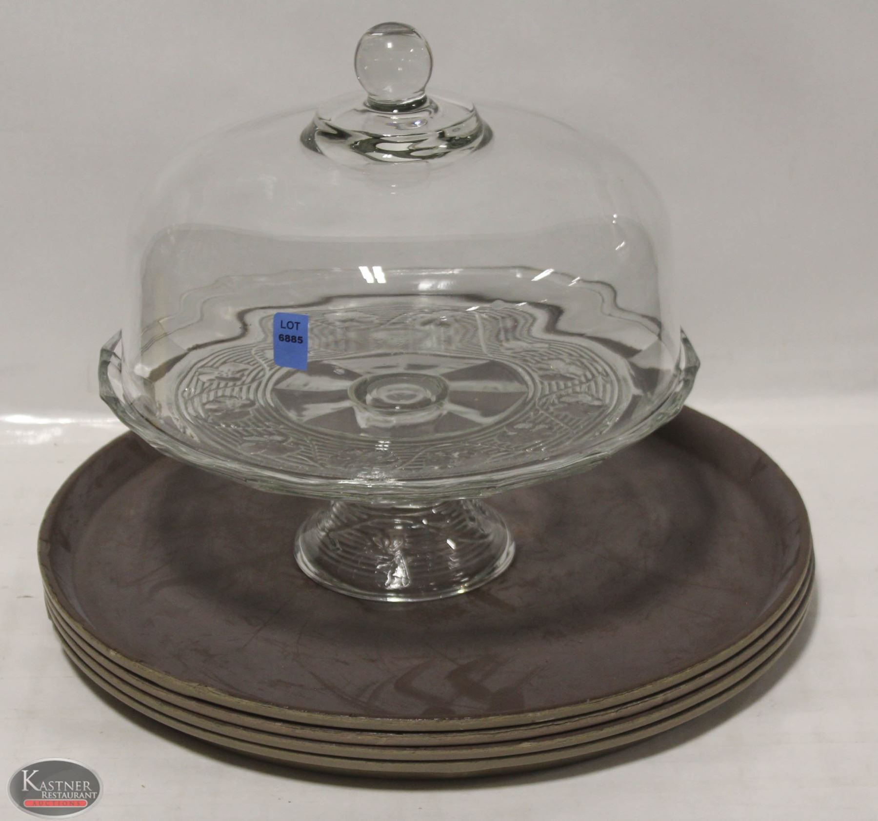 GLASS CAKE DISPLAY STAND & 4 SERVING TRAYS