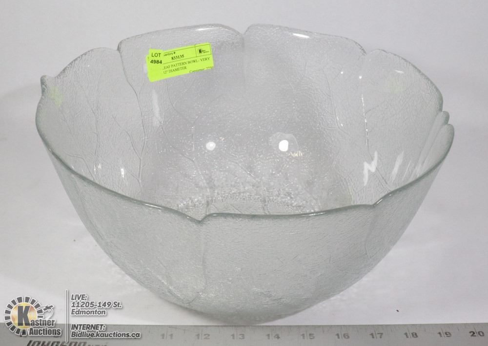 GLASS LEAF PATTERN BOWL- VERY LARGE 12" DIAMETER