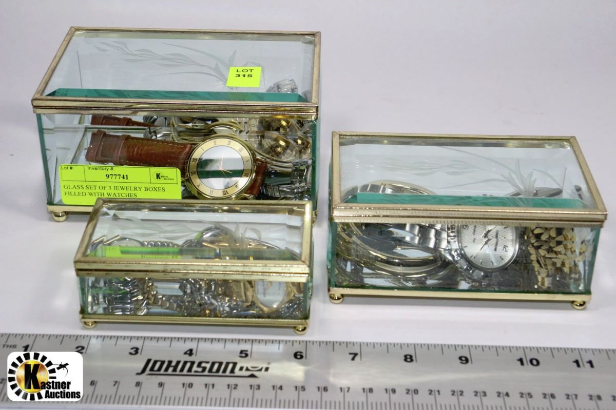 GLASS SET OF 3 JEWELLERY BOXES FILLED WITH WATCHES