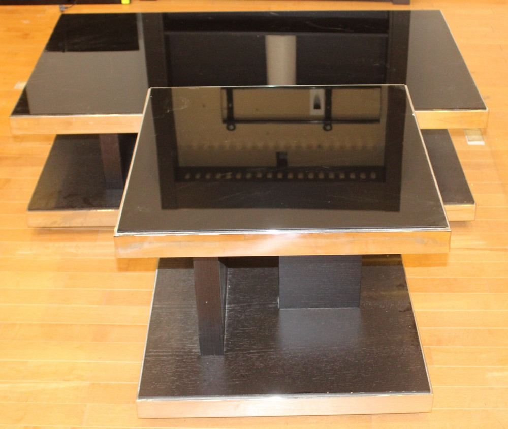 GLASS TOPPED METAL RIMMED COFFEE AND END TABLE