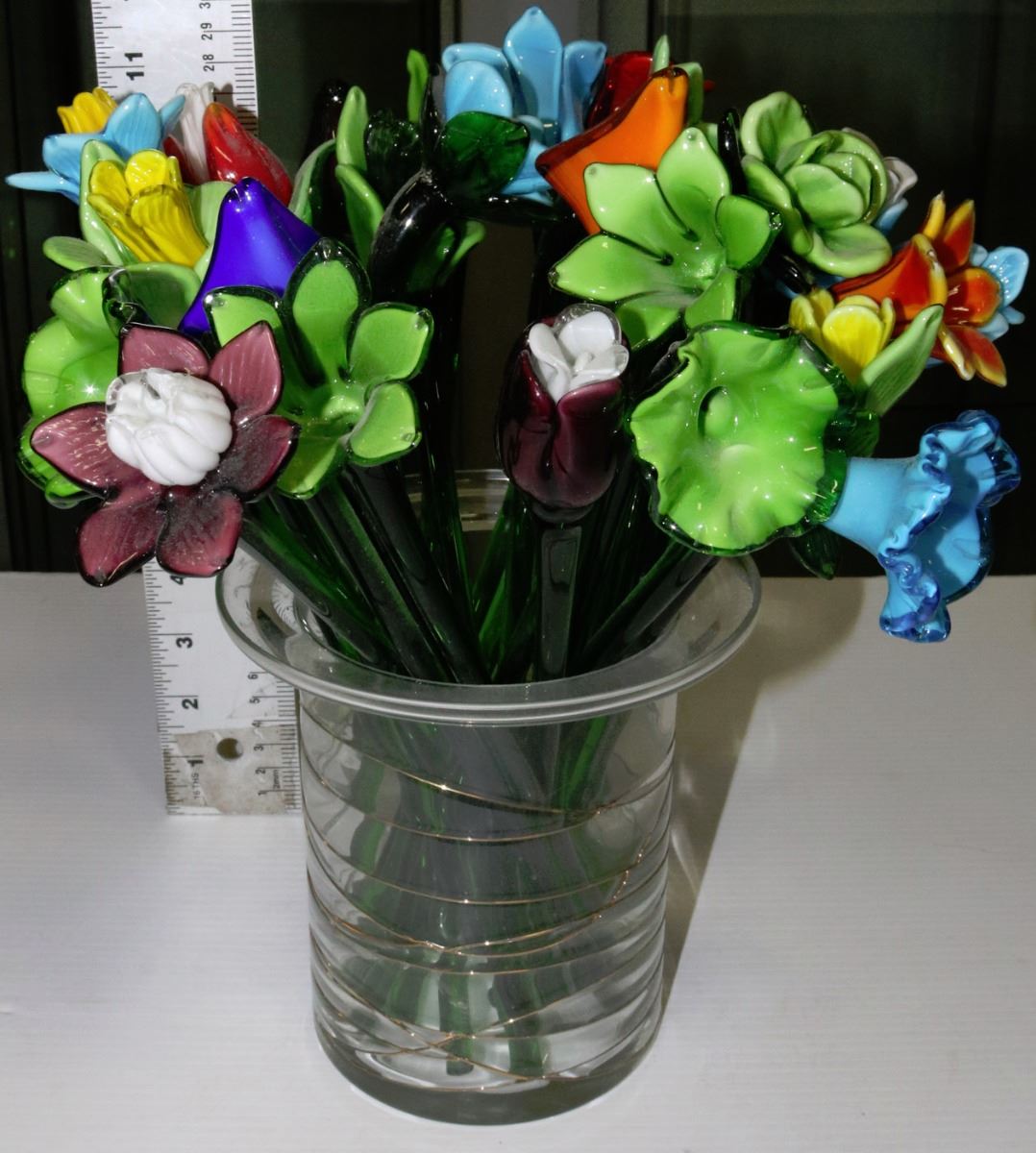 GLASS VASE WITH 24 GLASS FLOWERS