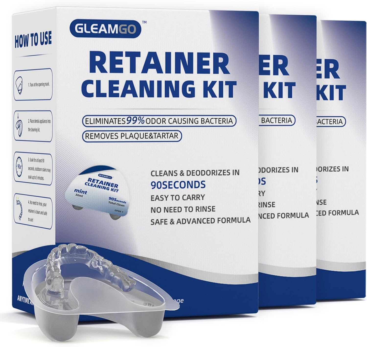 GLEAMGO ALIGNER CLEANER & CLEAR RETAINER CLEANER, CLEANING FLUID INCLUDED, PORTABLE FOR TRAVEL WORK SCHOOL, 90-SECOND FAST CLEANING, PATENTED & SAFE FORMULA, MINT FLAVOR, 30 COUNTS