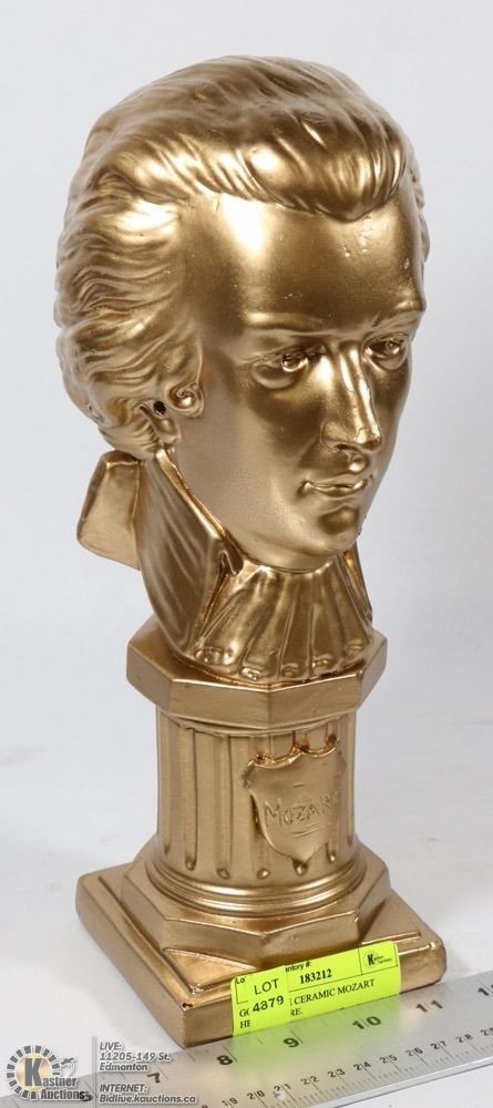 GOLD TONE CERAMIC MOZART HEAD FIGURE.