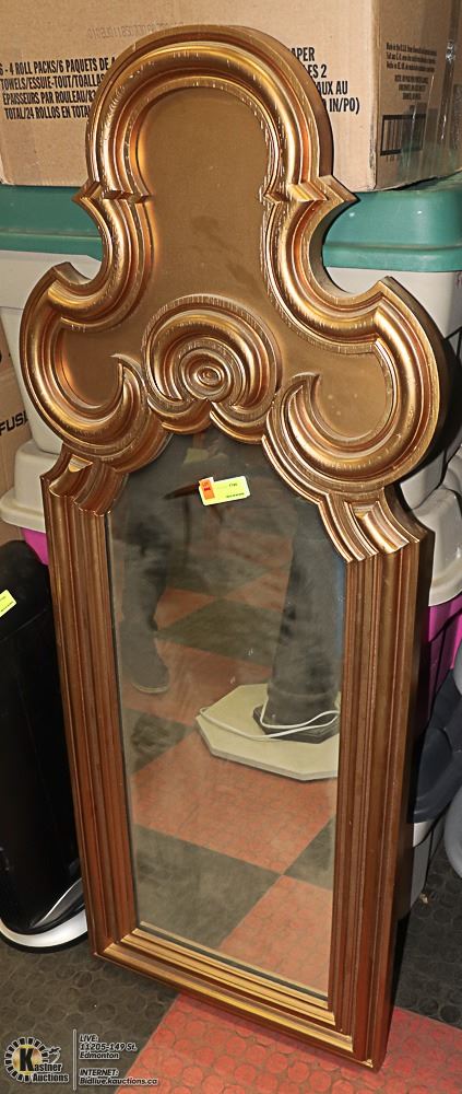 GOLD TONE FRAMED WALL HANGING MIRROR.