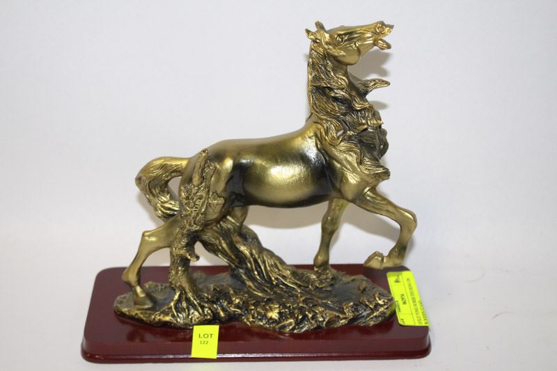 GOLD TONE HORSE FIGURING ON WOODEN STAND