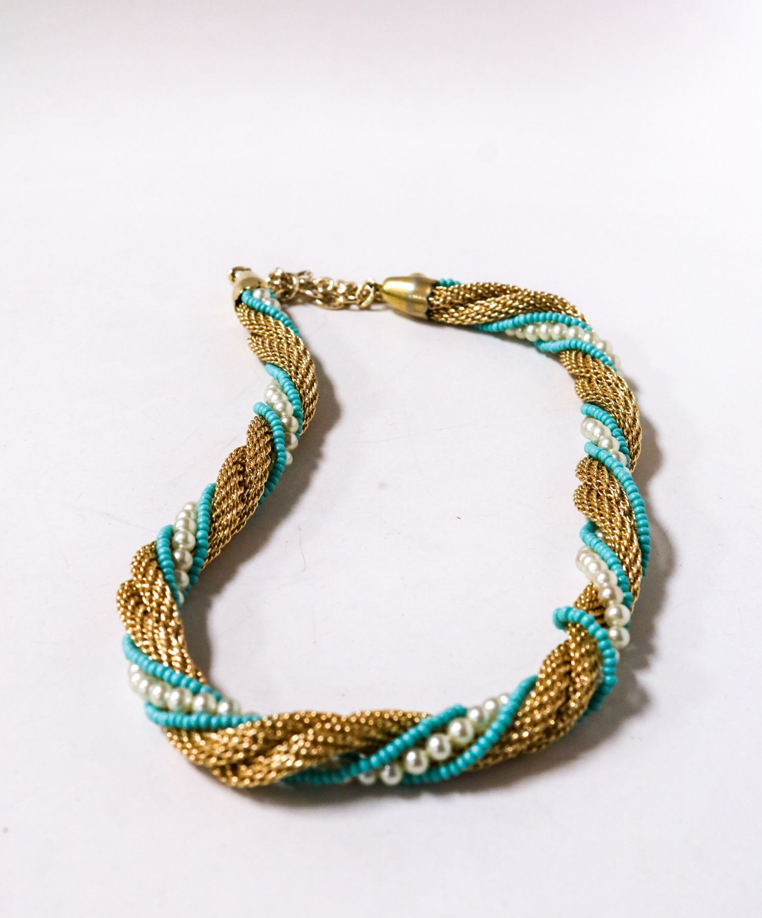 GOLD TONE MESH AND BLUE BEAD FASHION NECKLACE