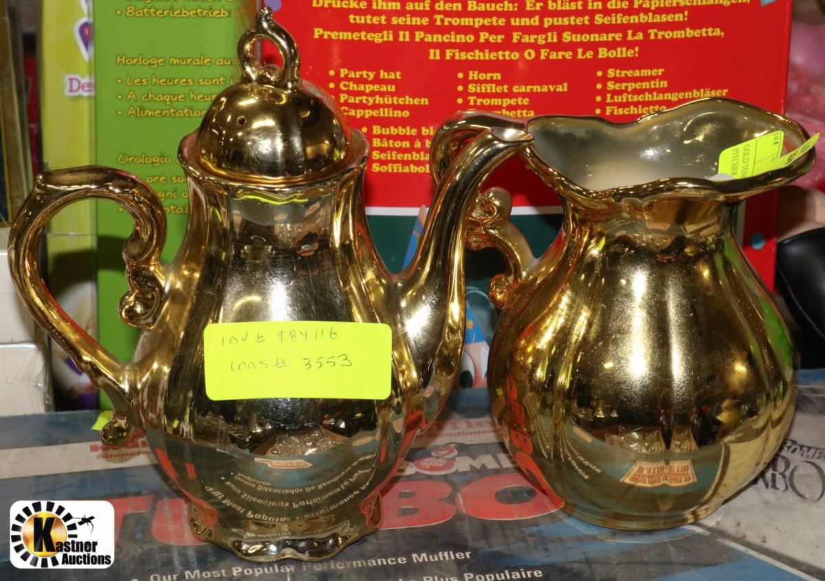 GOLD TONE PEACOCK TEAPOT AND PITCHER