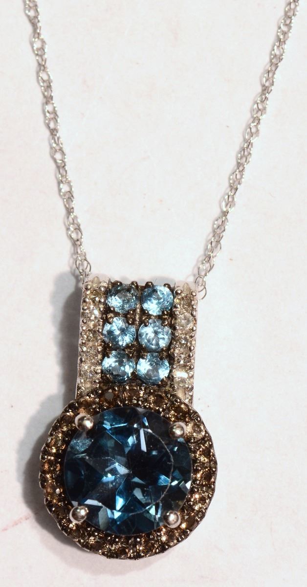 10K WHITE GOLD NECKLACE WITH A BLUE TOPAZ CENTER STONE SURROUND BY 20 SMOKEY QUARTZ STONES WITH 6 SMALLER BLUE TOPAZES ON TOP ALONGSIDE 10 DIAMONDS - SUGGESTED REPLACEMENT VALUE $1,200.00