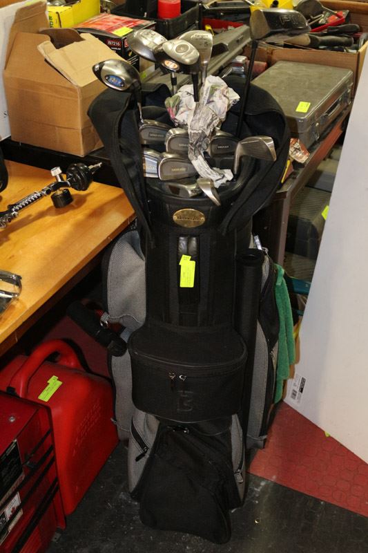 GOLF BAG WITH SOME "PING" CLUBS, BALLS, TEES, ETC