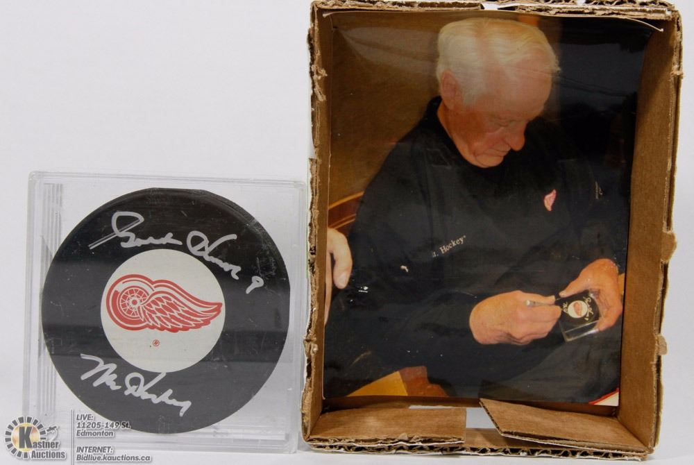 PUCK. WITH A PICTURE OF GORDIE HOWE SIGNING IT . SIGNED “GORDIE HOWE #9, MR. HOCKEY”. COLLECTIBLES