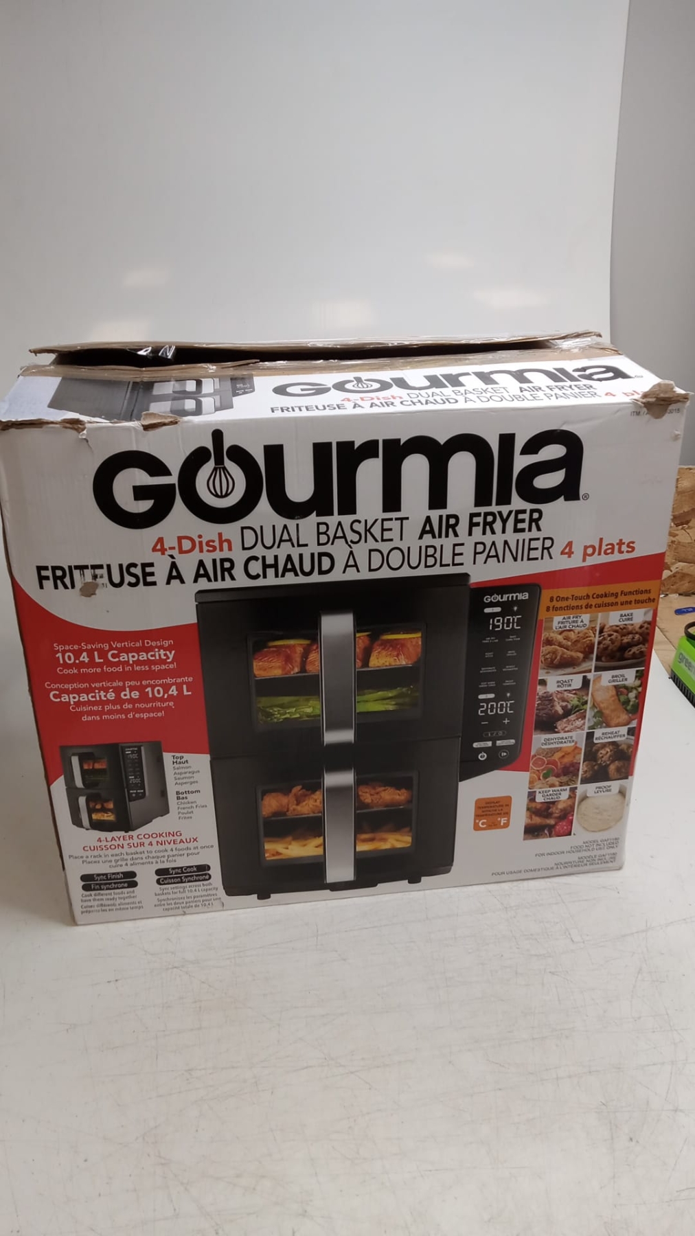 GOURMIA 4 DISH DUAL BASKET AIR FRYER WITH SYNC FINISH & SYNC COOK, 10.4 L (11 QT.) (USED, MISSING 1 TRAY)