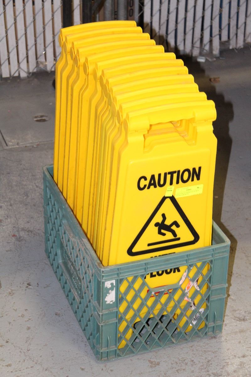 GREEN CRATE WITH 12 CAUTION WET FLOOR SIGNS