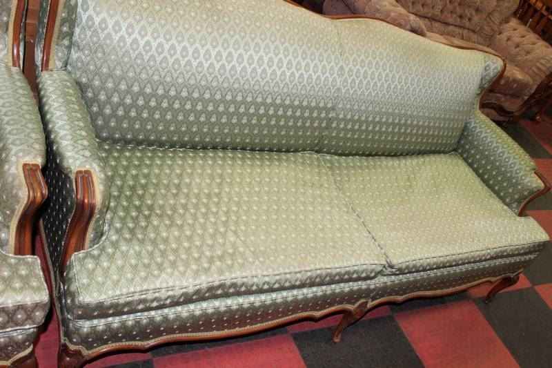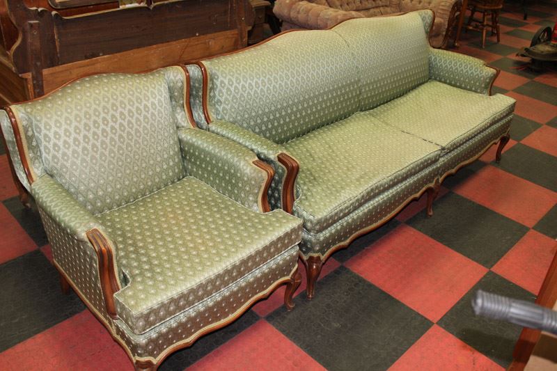 GREEN FRENCH PROVINCIAL VINTAGE SOFA W CHAIR