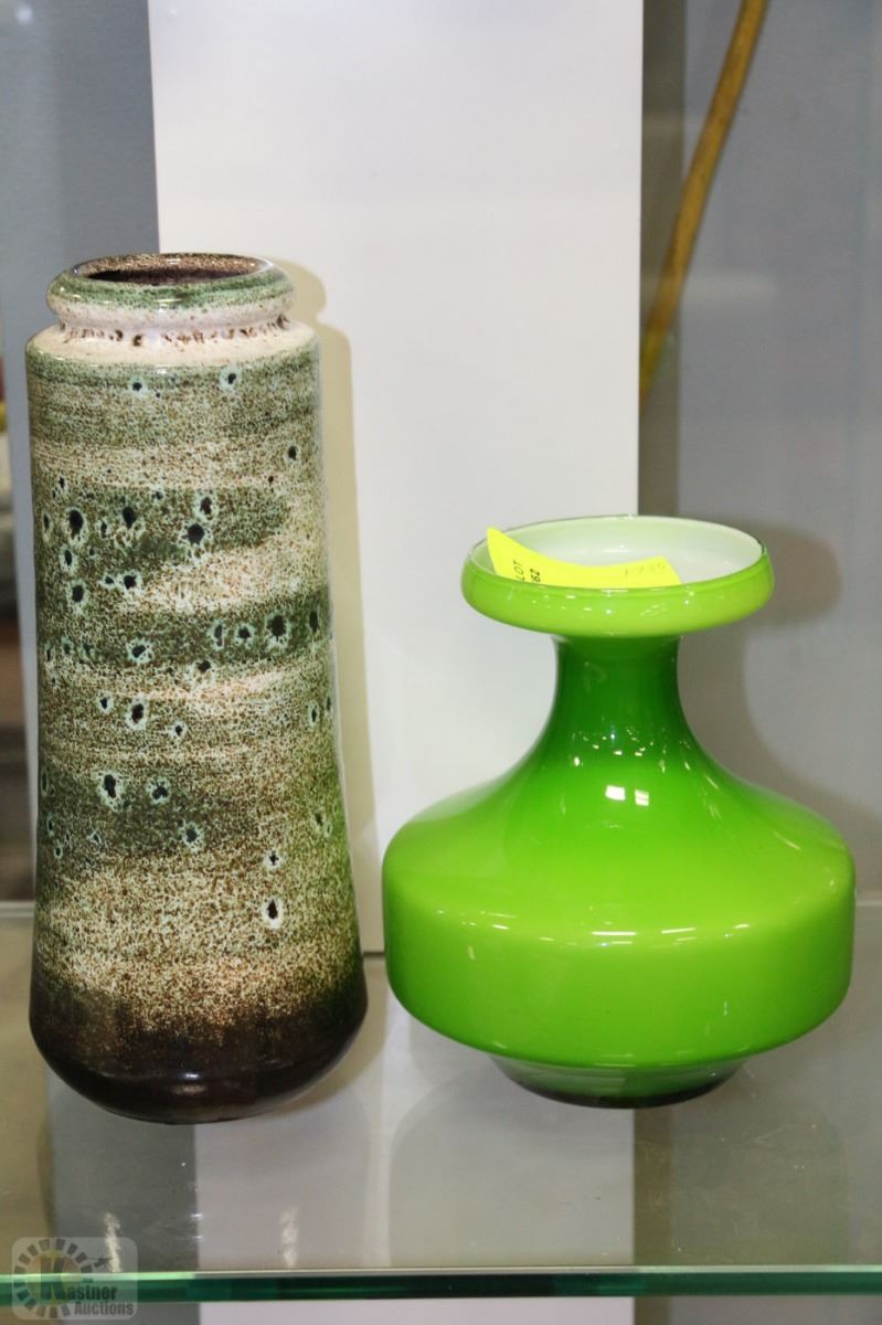 GREEN GLASS VASE SOLD WITH CERAMIC VASE