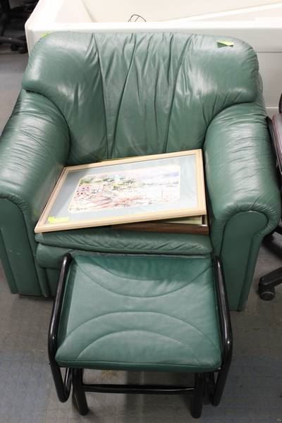 GREEN LEATHER CHAIR WITH ROCKING OTTOMAN