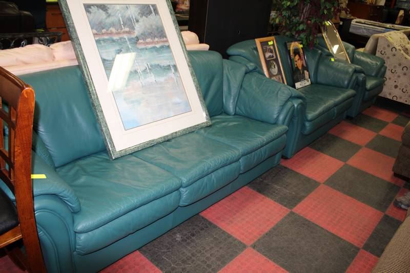 GREEN LEATHER SOFA LOVE SEAT AND CHAIR