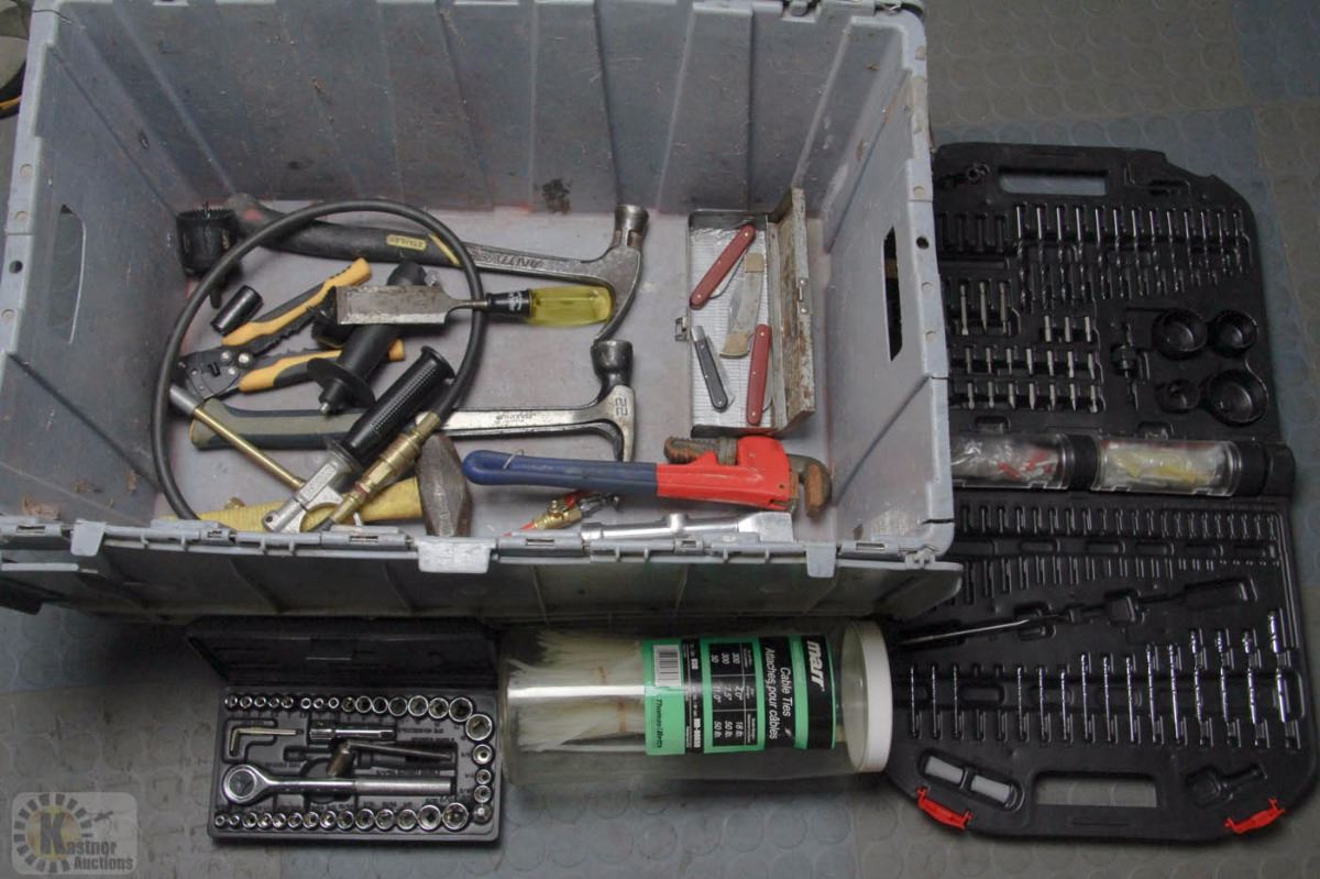 GREY TOTE & CONTENTS- ZIP TIES ,TOOLS,ETC