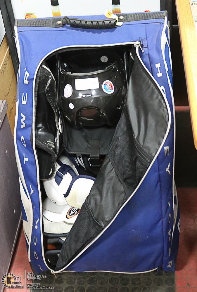 EQUIPMENT/GEAR BAG - FULL OF QUALITY MENS HOCKEY GEAR - MEN'S TACKS 450 SIZE 10.5 SKATES, MEN'S SR MED. PANTS, ELBOW PADS, GLOVES, SHIN GUARDS, ETC. - GENERAL, SPORTS