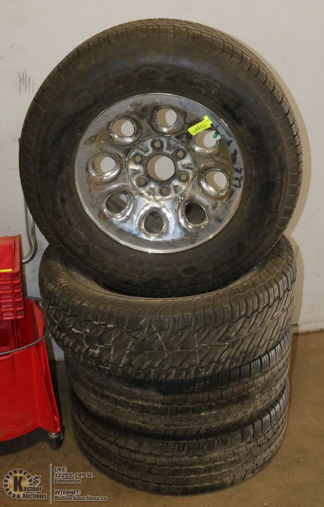 GROUP OF 4 ASSORTED TIRES WITH ONE 6 BOLT RIM