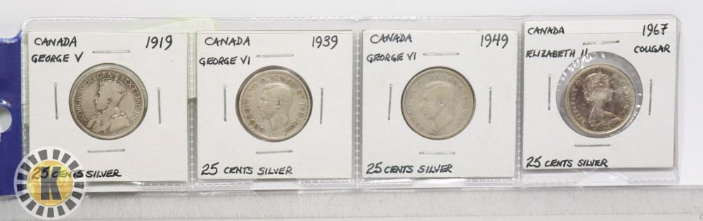 INCLUDING A 1919 STERLING SILVER 25 CENT, 1939&1949 GEORGE VI AND 1967 CENTENNIAL BOBCAT SILVER 25 CENT***ITEM IS LOCATED IN LETHBRIDGE ALBERTA, PICKUP IS AT OUR LETHBRIDGE LOCATION ONLY, WORLDWIDE SHIPPING IS AVAILABLE***