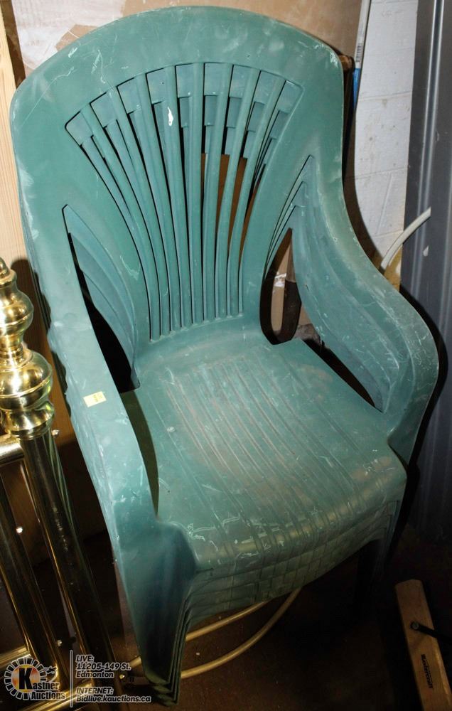 GROUP OF 4 GREEN PLASTIC LAWN CHAIRS (ROUGH SHAPE)