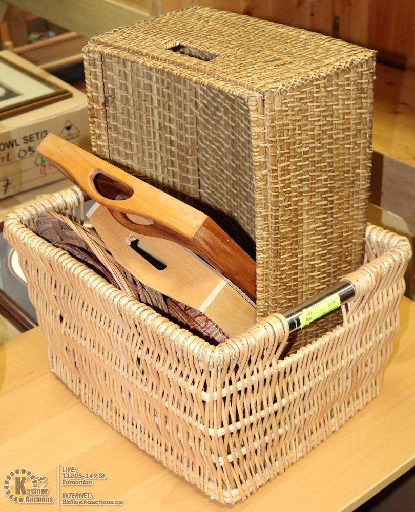GROUP OF WICKER BASKETS WITH WOOD TRAYS