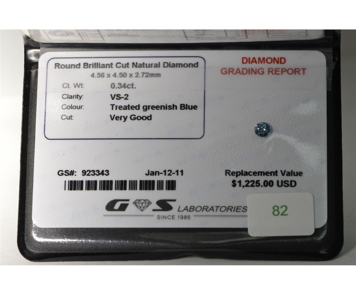 0.34 cts, Greenish Blue Colour, Round Brilliant Cut, VS-2 Clarity, with certificate