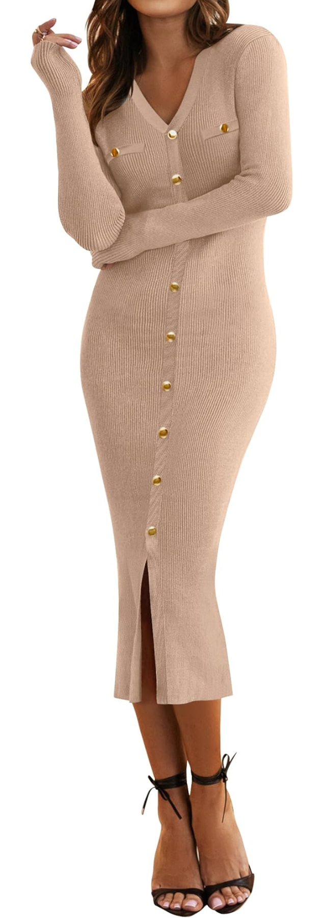 HAEOF WOMEN'S 2024 FALL TRENDY LONG SLEEVE MIDI SWEATER DRESS DRESSY CASUAL V NECK RIBBED KNIT WINTER FORMAL BODYCON DRESSES
