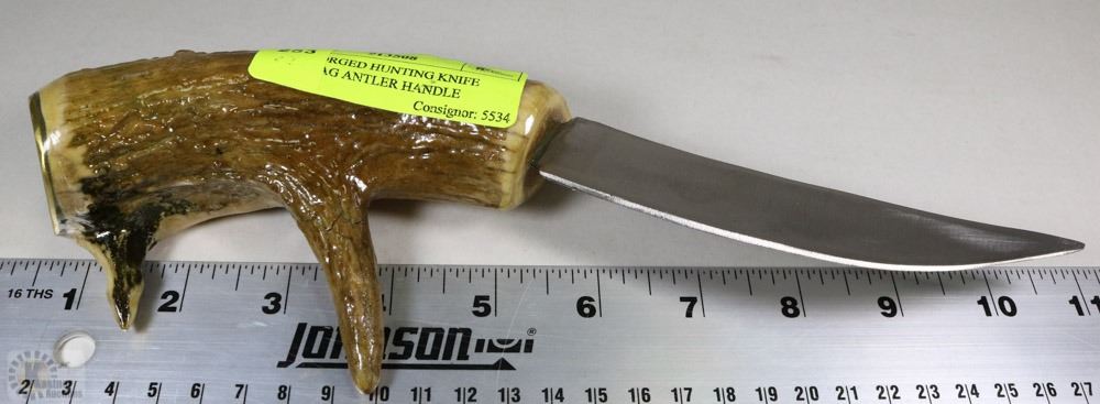 THE DEER ANTLER HANDLE AND BLADE ARE BOTH HAND FORGED BY A LOCAL SILVERSMITH