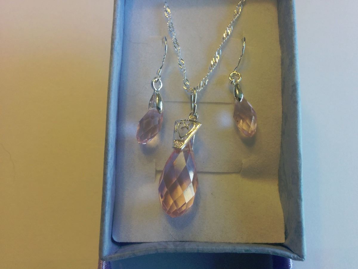 EARRINGS ARE 8MM & PENDANT IS 20MM, BRIOLETTE CUT, PALE PINK, EARRINGS ARE SET IN .925