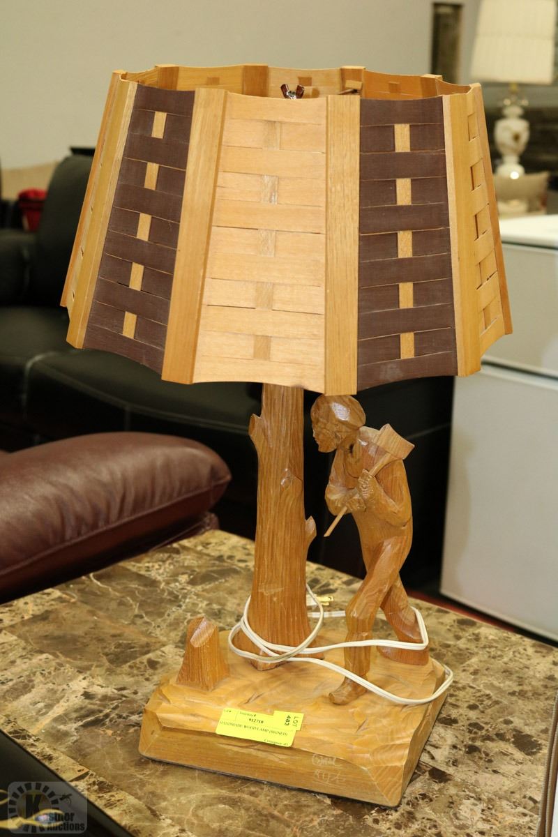 HANDMADE CARVED WOOD LAMP (SIGNED)