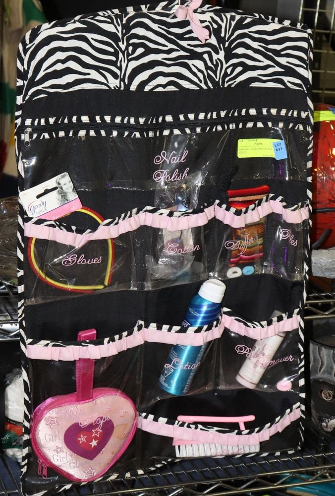 BLACK AND PINK ORGANIZER FILLED WITH TOILETRIES AND MORE. WELLNESS