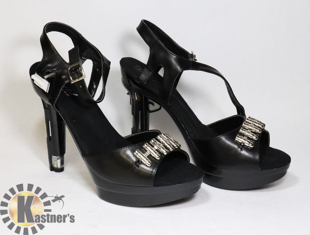 BLACK SLIP ON PLATFORM OPEN TOE HEELS; SIZE 10