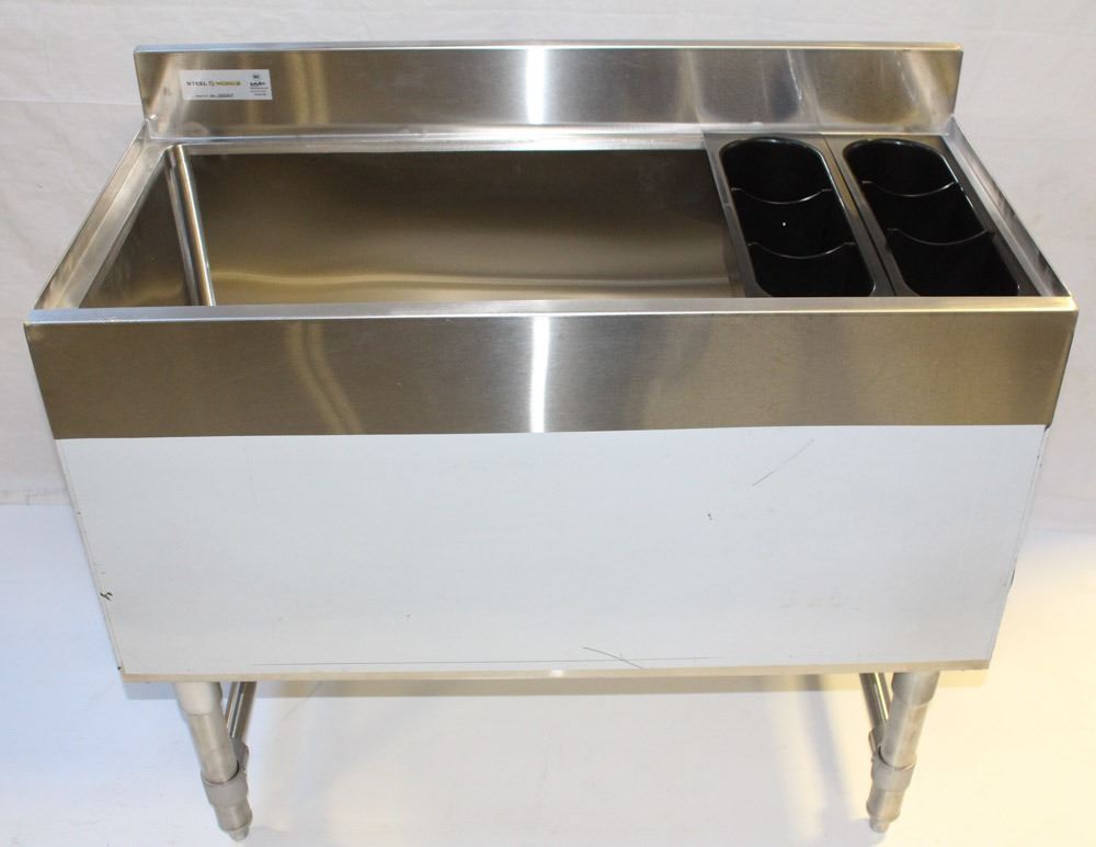 MV17 - NEW ICE BIN 18-1/2"X36"X30"H WITH 3" BACKSPLASH, 14-13/16"X34"X15" BOWL 20GA.304S/S BOWL, TOP, BACK AND BODY, S/S LEG AND SOCKET, S/S BULLET FOOT U SHAPE LEG BRACING, PLASTIC BOTTLE HOLDER INCLUDED
