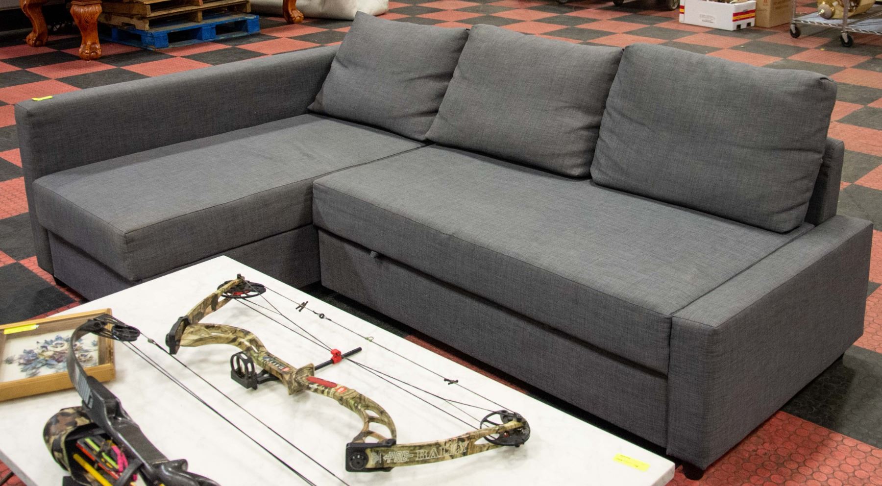 PULL OUT HIDE-A-BED AND BLANKET STORAGE; 9 PIECES PLUS ALL HARDWARE. GREY