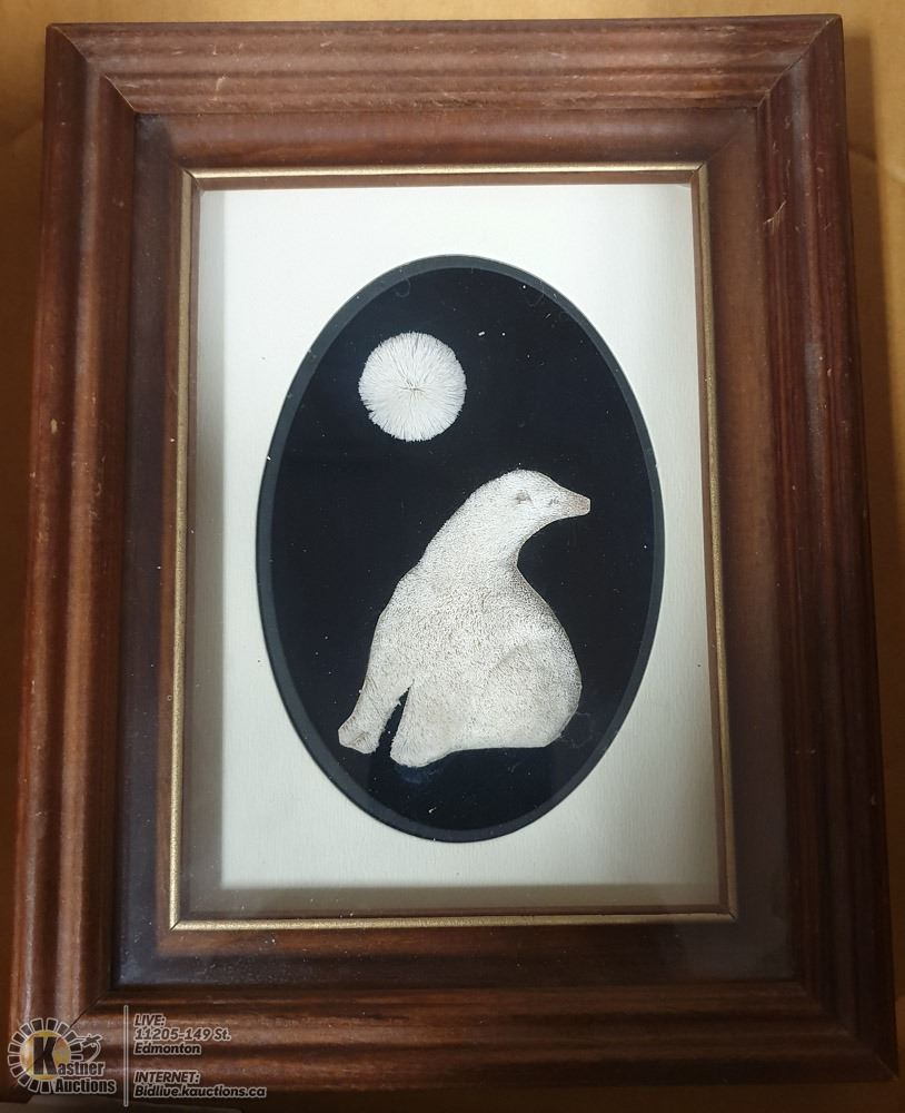 WELL KNOWN INUIT ARTIST,POLAR BEAR AND MOON IN FRAMED SHADOWBOX,COA ON BACK-ART