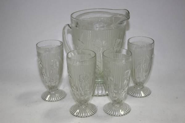 IRIS AND HERRINGBONE JUICE PITCHER W/GLASSES