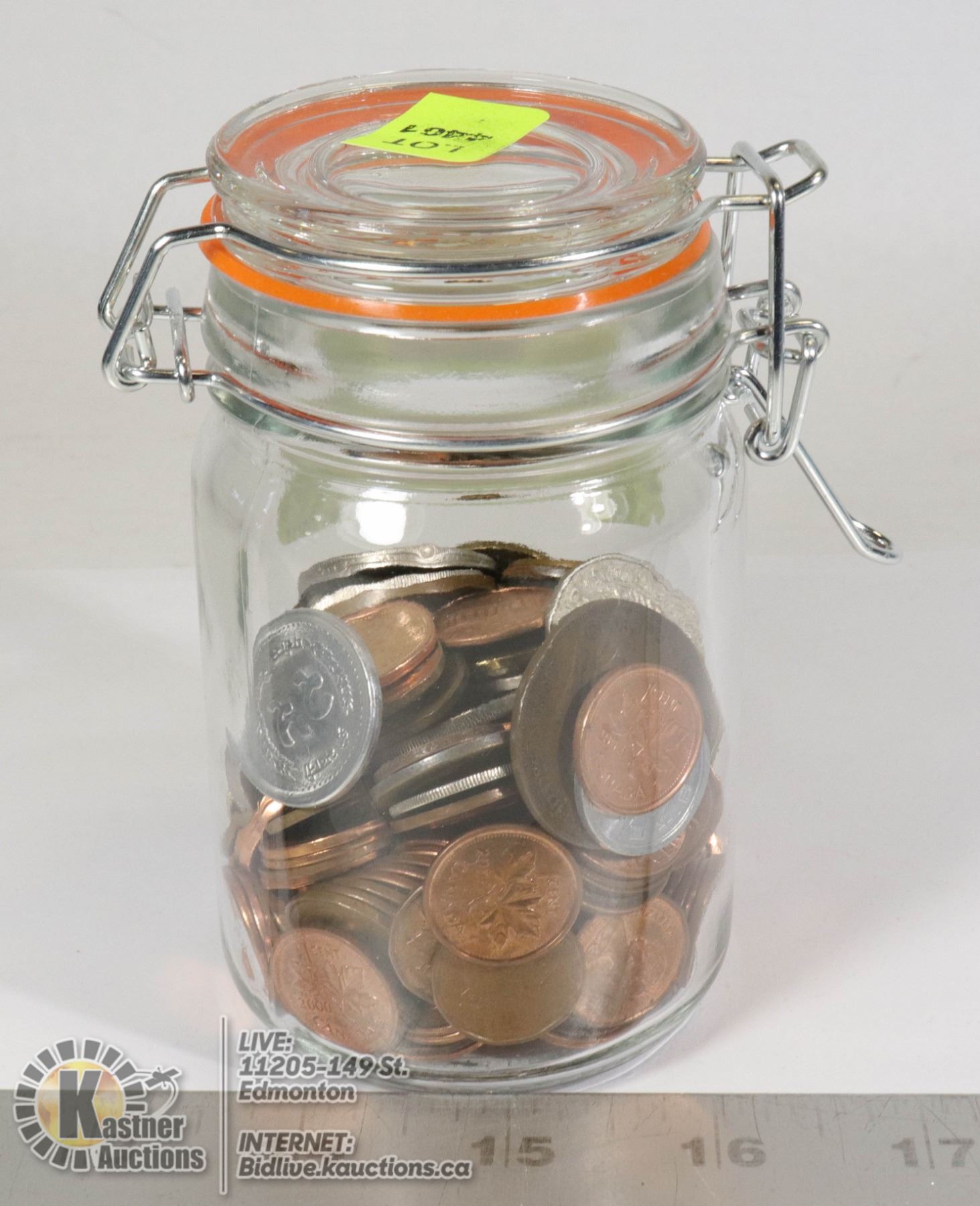 JAR WITH OLD MIXED WORLD COINS & PENNIES