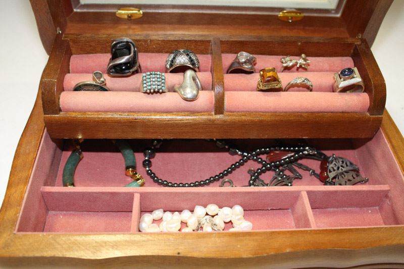 JEWELLERY BOX WITH CONTENTS - PEARLS AND COSTUME