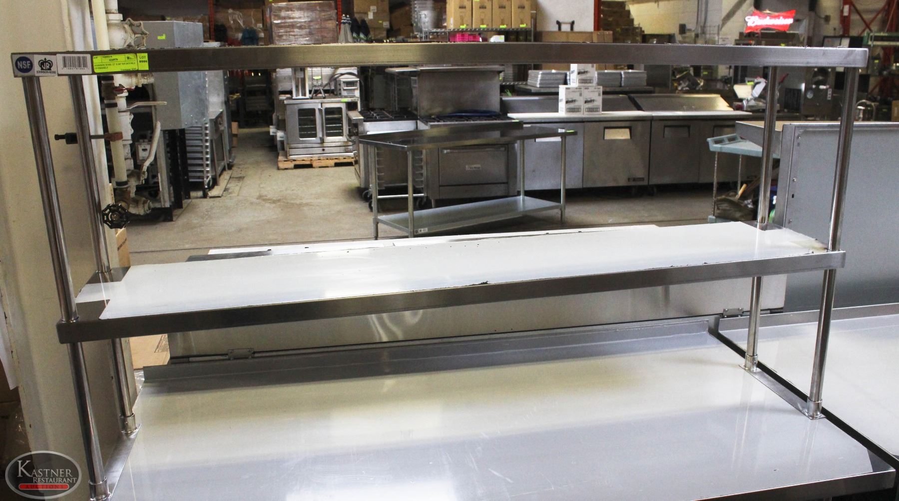 DD26 NEW JOHNSON ROSE 81262, TABLE-MOUNTED, 18 GAUGE 430 STAINLESS STEEL, 12" X 62", DOUBLE TIER, 31" STAINLESS STEEL LEGS AND SOCKET, EASILY ATTACHES TO WORKTABLES.