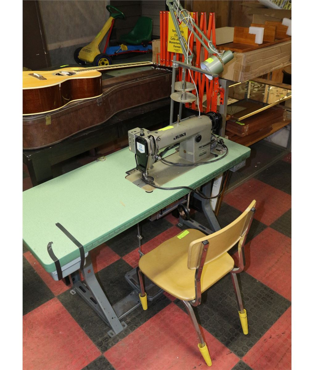 MOUNTED ON METAL SEWING TABLE. COMES WITH MATCHING ADJUSTABLE DESK LAMP & AND A CHAIR