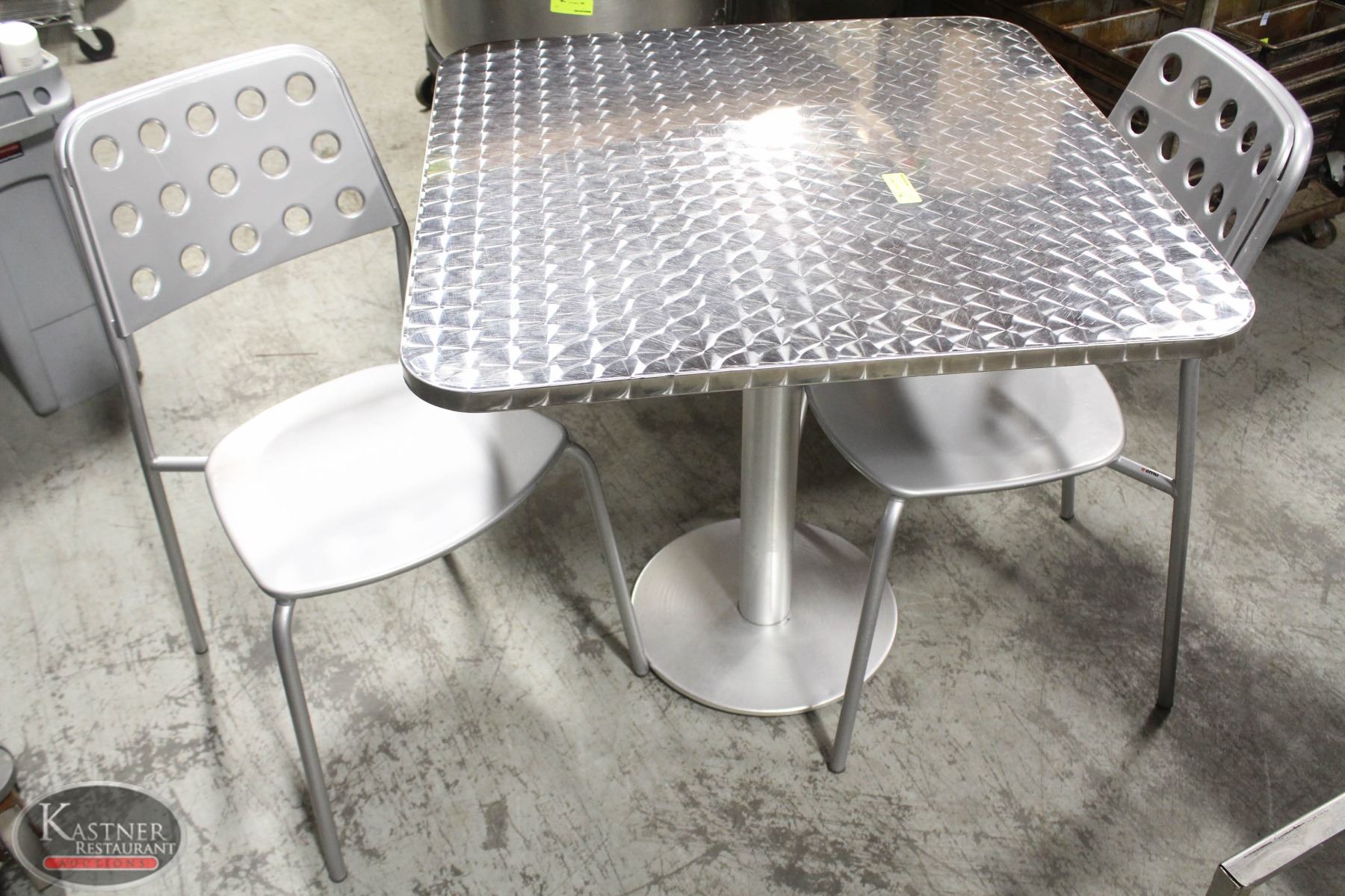 W/ 2 METAL CHAIRS. TABLE DIMENSIONS 31.5"X31.5"X29"