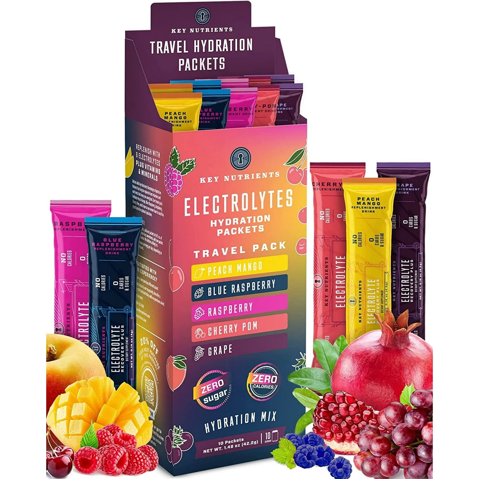 KEY NUTRIENTS - ELECTROLYTES POWDER - VARIETY MIX PEACH MANGO, BLUE RASPBERRY, RASPBERRY, CHERRY POM, GRAPE - HYDRATION POWDER - 10 TRAVEL PACKETS