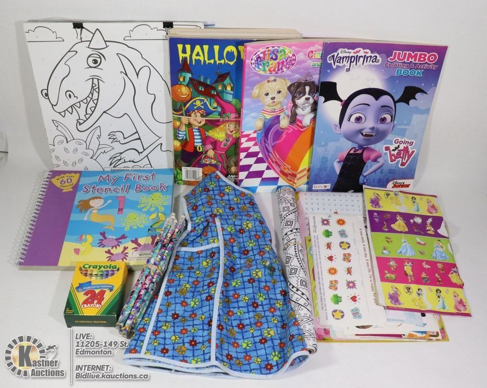 KID'S LOT-COLORING SHEETS/BOOKS, CRAYONS, STICKERS