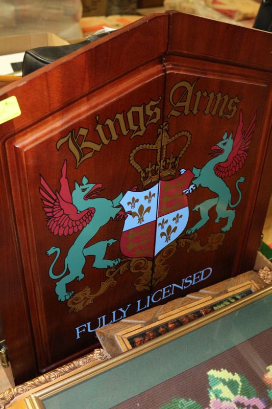 KINGS ARMS DARTBOARD IN WOODEN CABINET